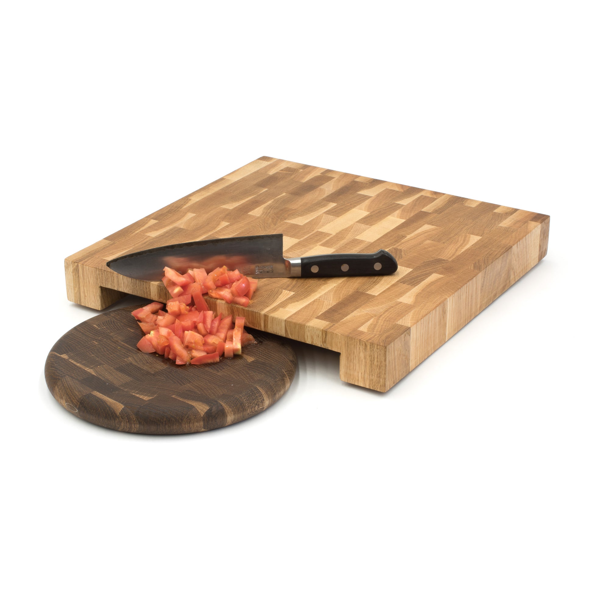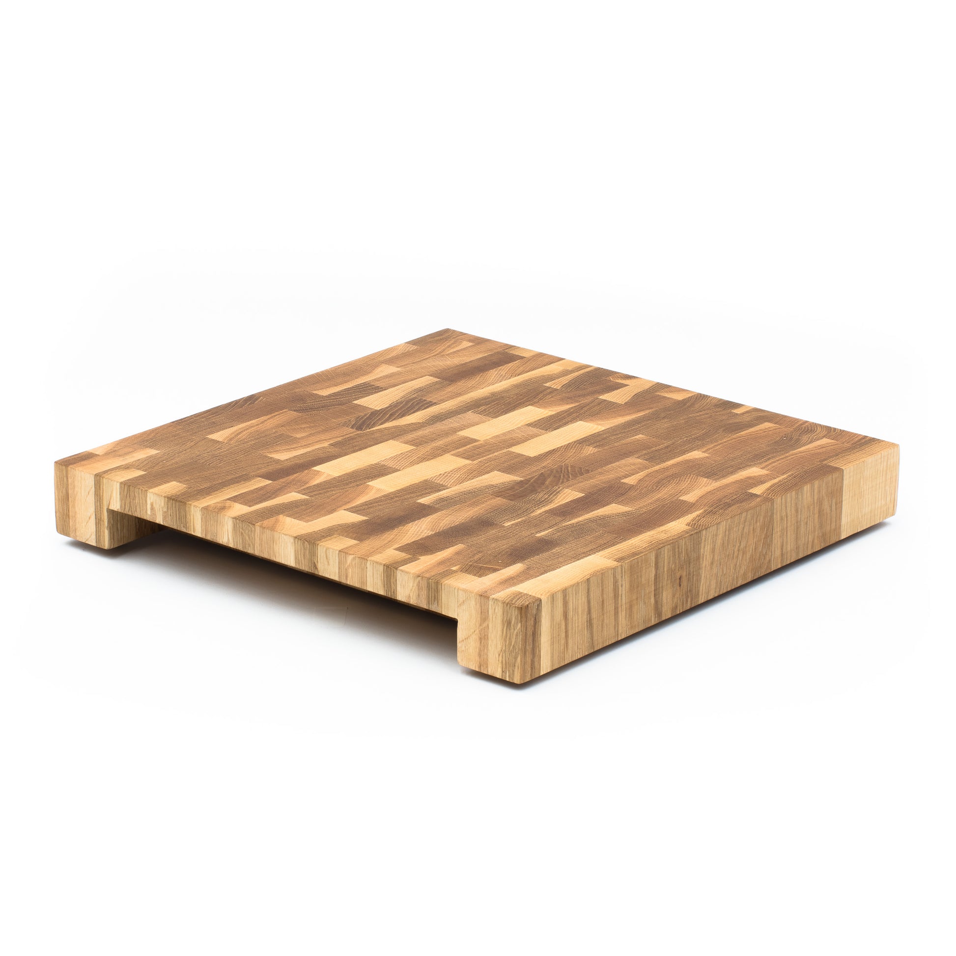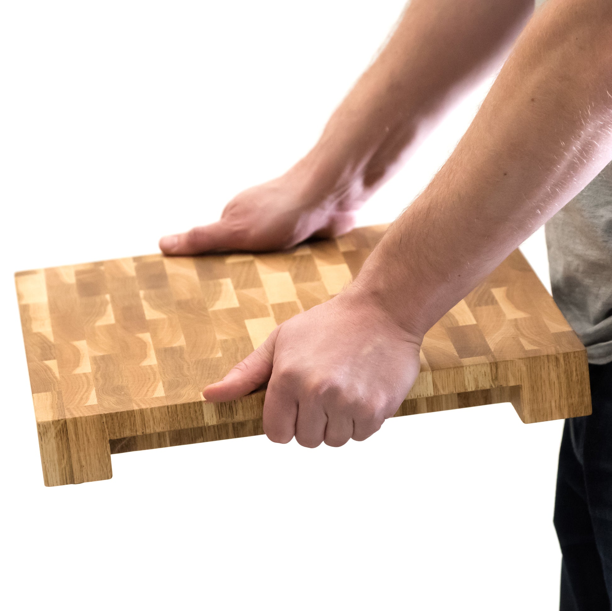 Our Endgrain Chef Block No.3 is designed with large hand holds on each side, making the board easy to carry, wash and move around the kitchen. The hand holds are also designed to allow a plate or serving board to slide underneath allowing you to transfer food or scraps onto another surface. The board has four high quality non-slip rubber feet which stabilise the board