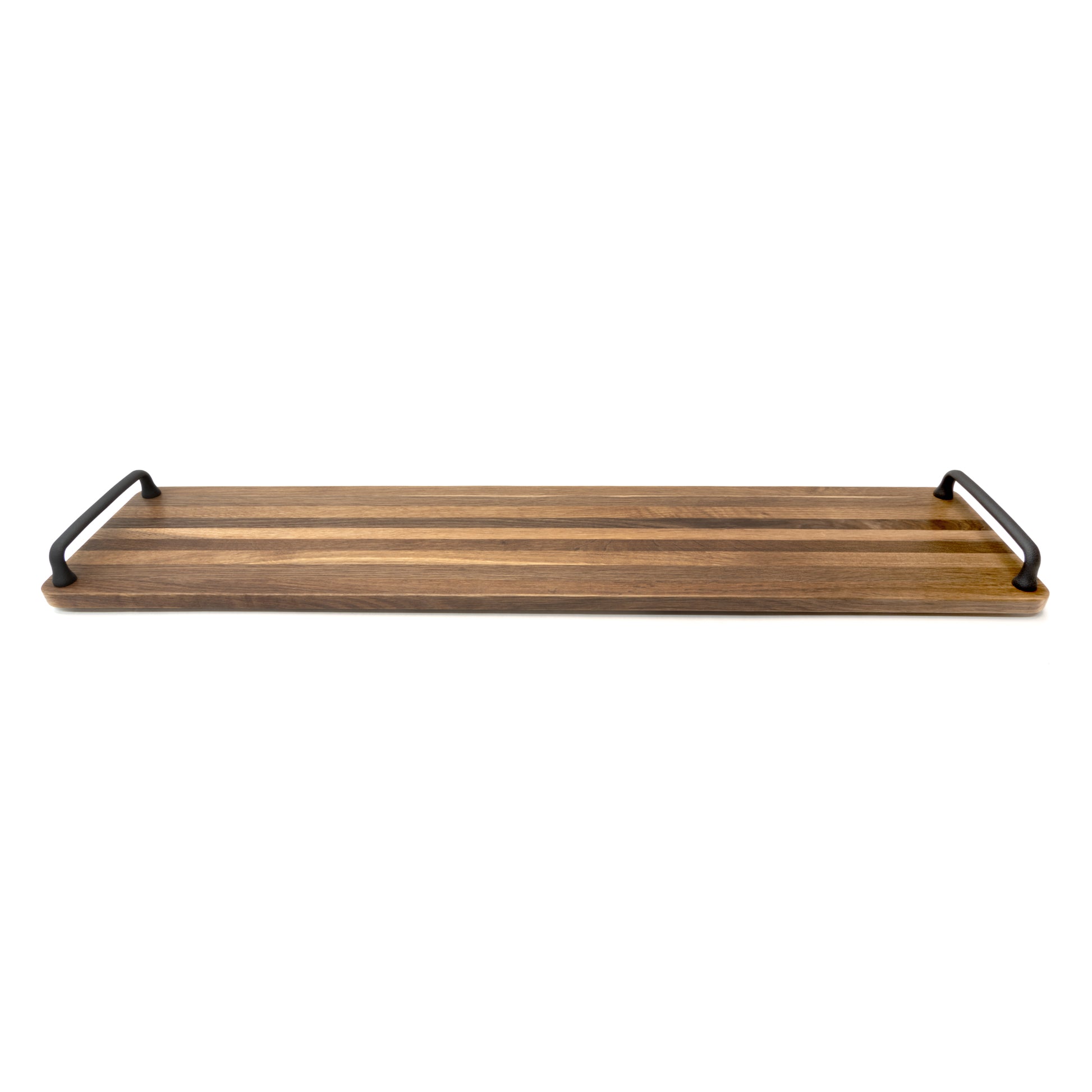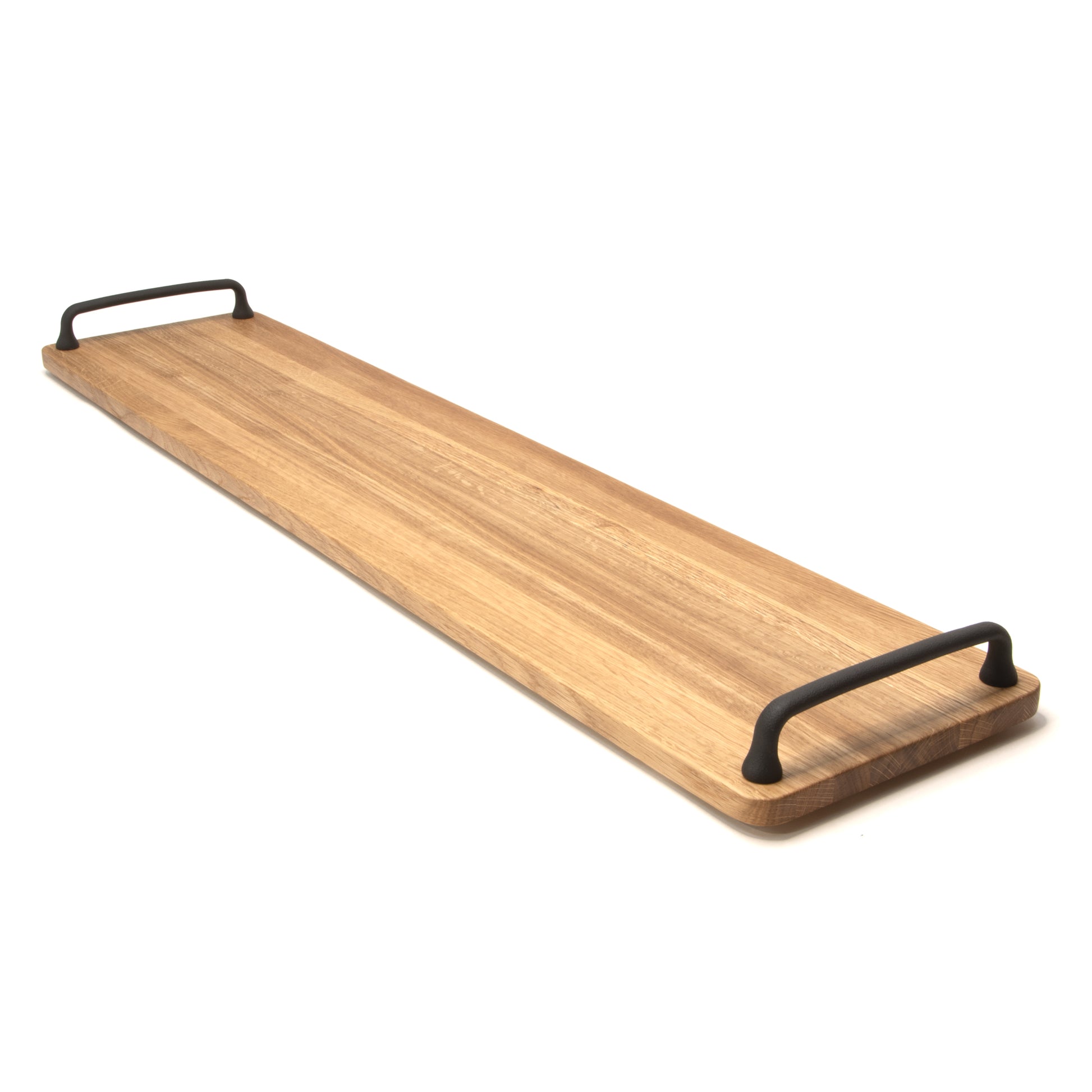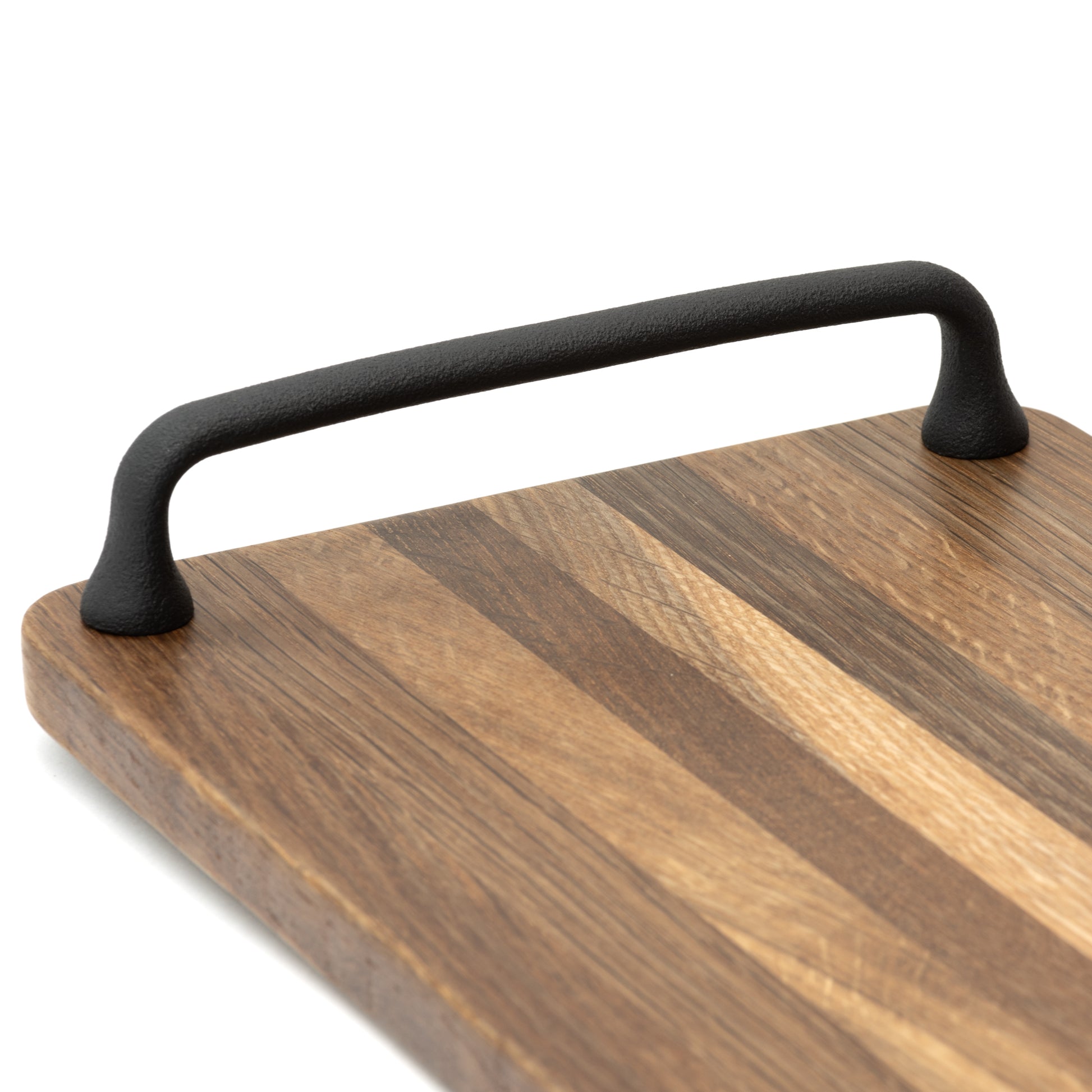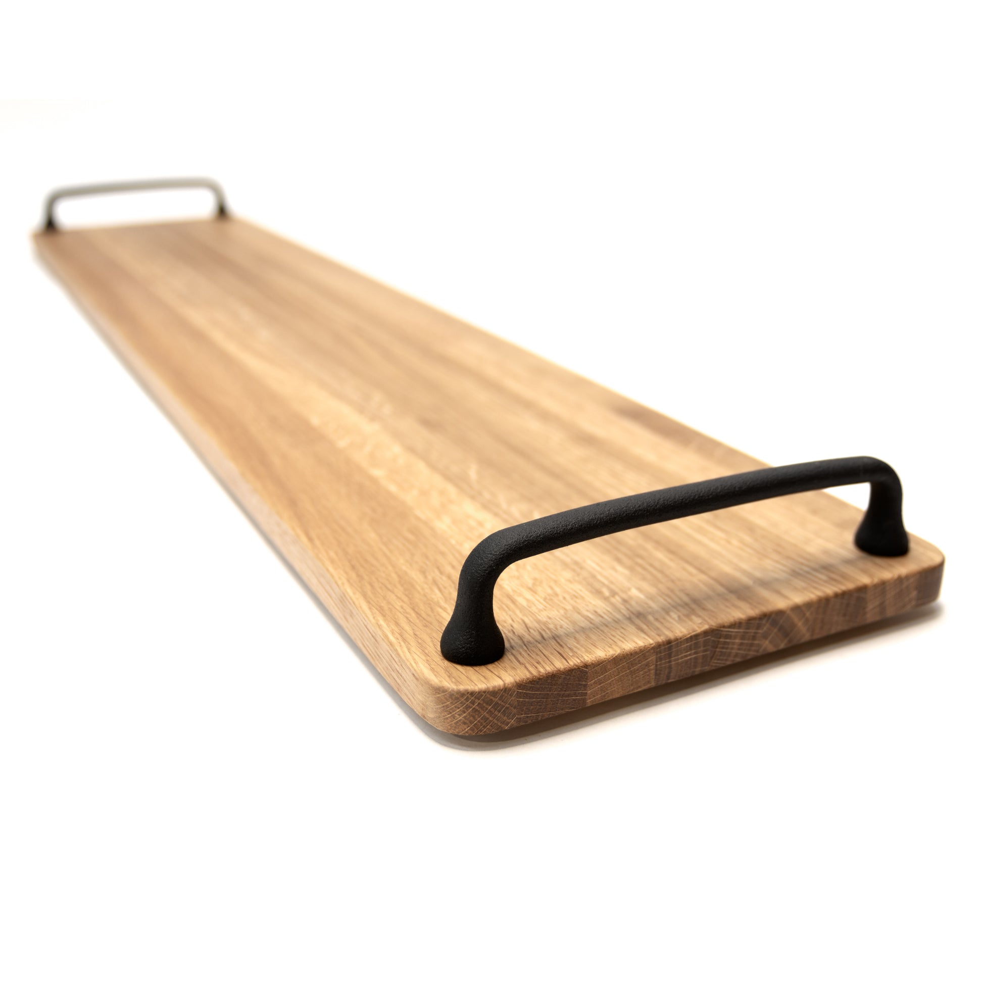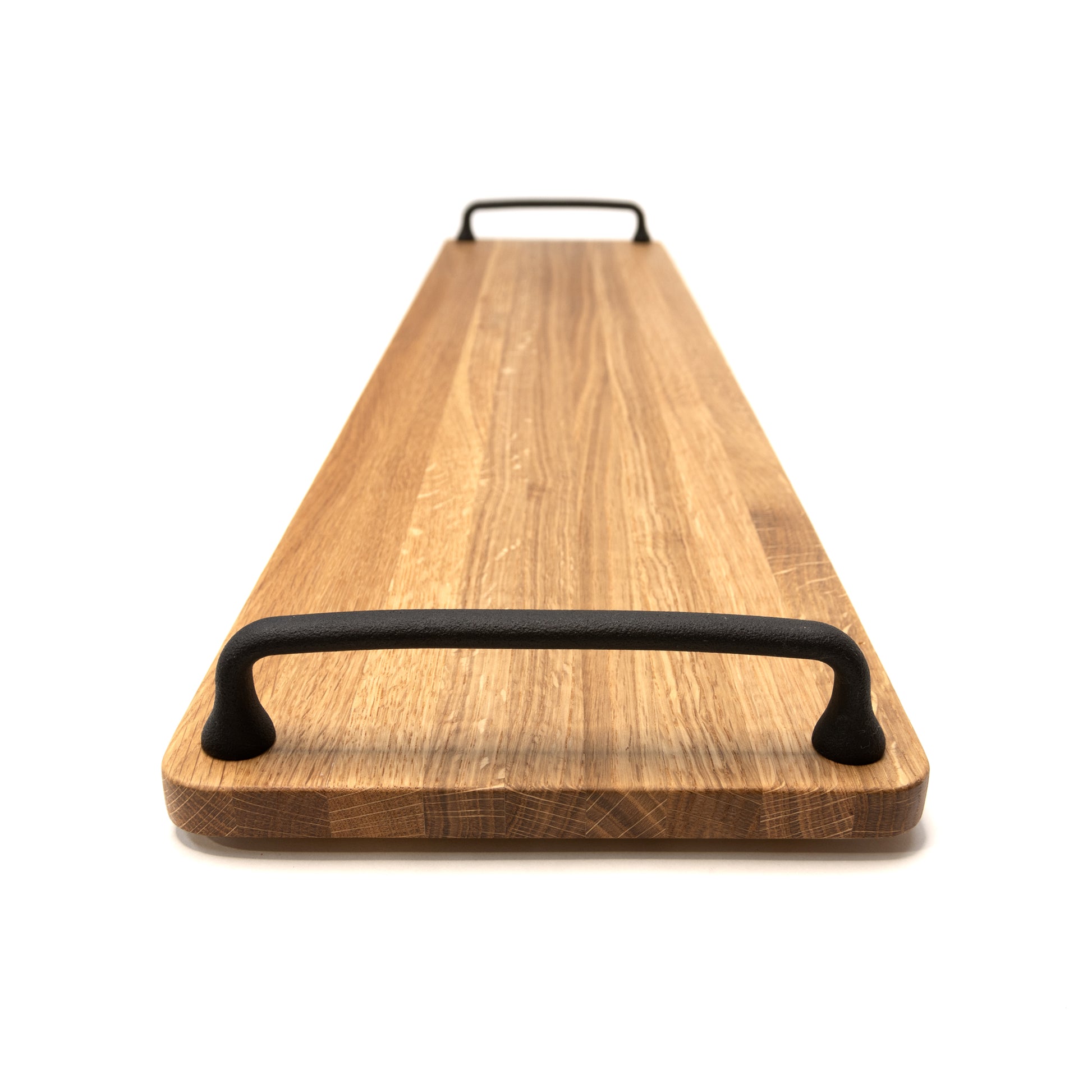 The Iron Grip Serving Platter No.1 is crafted from solid oak and features matte black powder-coated cast iron handles. The base features non-slip silicone feet which elevate the board slightly to protect your table. It is 885mm in length, perfect for entertaining and parties. Its solid oak board and danish made cast iron handles provide stability and elegance, making it an ideal accent piece for any gathering.